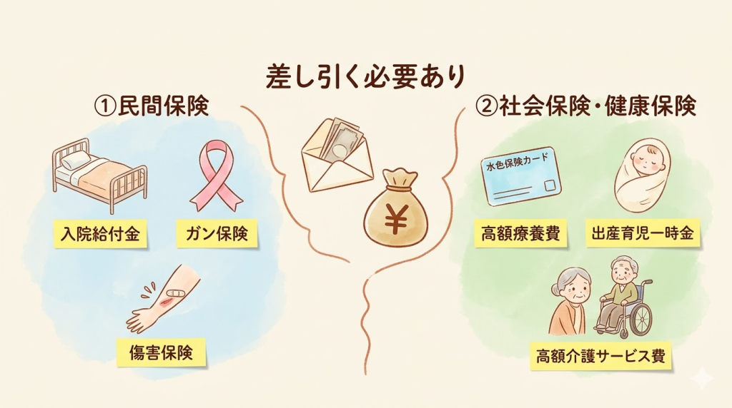 名前が似ていたり、同じ保険から出るため混同しがちですが、以下のものは差し引く必要はありません。