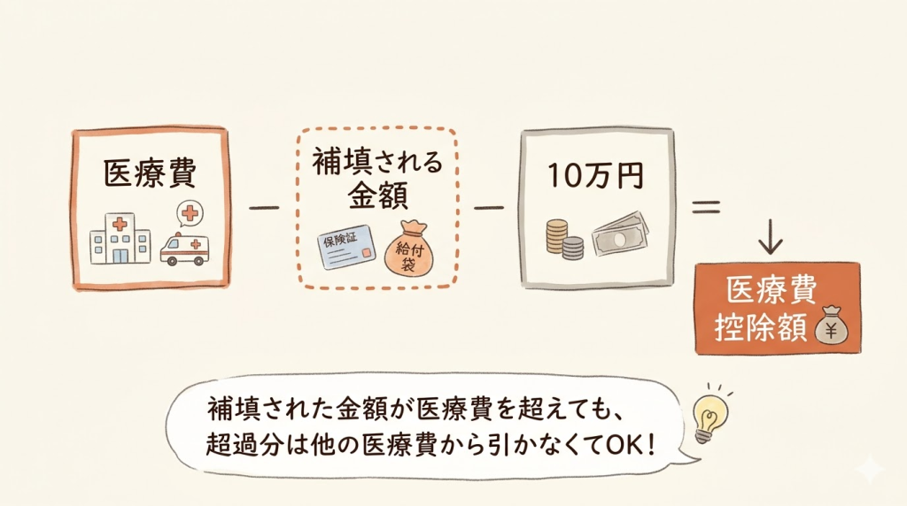 「補填される金額」のポイントは、「その給付金は医療費の補填として支給されたものか」という性質で判断することです。収入の補償(傷病手当金等)は差し引きませんが、自治体の助成金や互助会からの給付金は医療費を補填するための性質であるため、差し引く対象となります。判断に迷う場合は、給付の名称ではなく「何のための給付金か」を確認するようにしましょう。