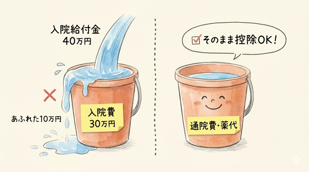 • 例: 入院費30万円に対し、入院給付金40万円を受け取った場合、超過した10万円を他の通院費や薬代から差し引く必要はありません。