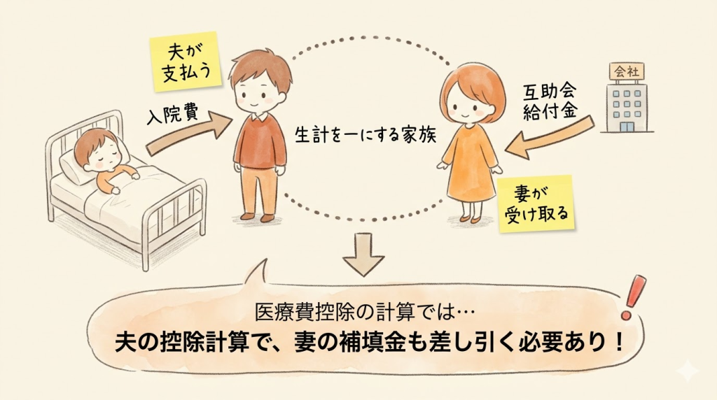• 例: 子の医療費を夫が支払い、妻の会社の互助会から補填金が支給された場合、夫の控除計算においてその補填金を差し引きます。
