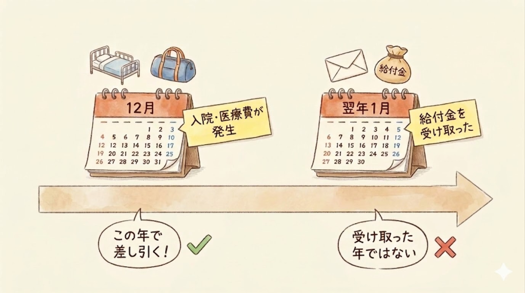 受け取った年ではなく、補填の対象となった医療費が発生した年に差し引くのが原則です。